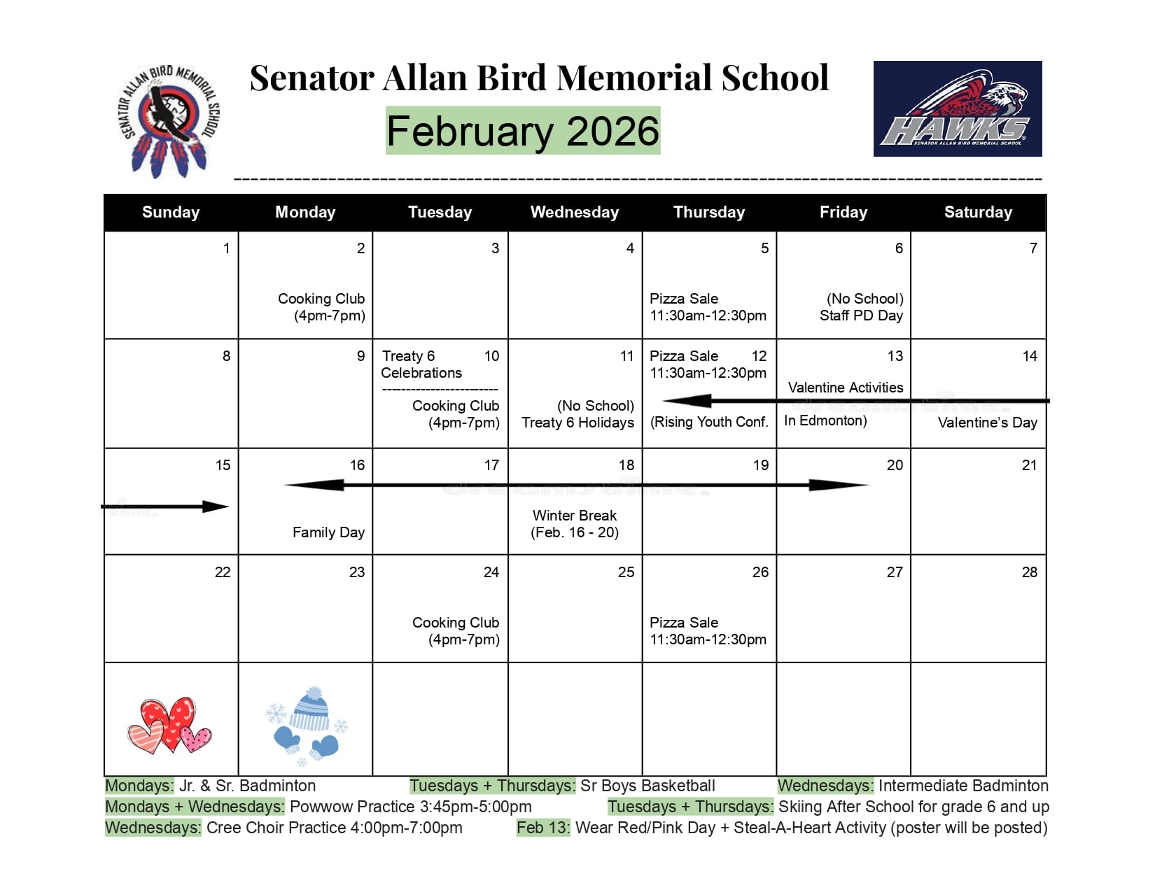 This is the Senator Allan Bird Memorial School calendar for February 2026. It highlights important dates such as Treaty 6 Celebrations, Valentine’s Day activities, Family Day, Winter Break (Feb. 16–20), staff PD day (no school), and Treaty 6 Holiday (no school). It also includes recurring events like Cooking Club, Pizza Sales, sports practices, choir practice, and special activities such as the Rising Youth Conference and Wear Red/Pink Day.You can download this calendar by clicking on the button below.