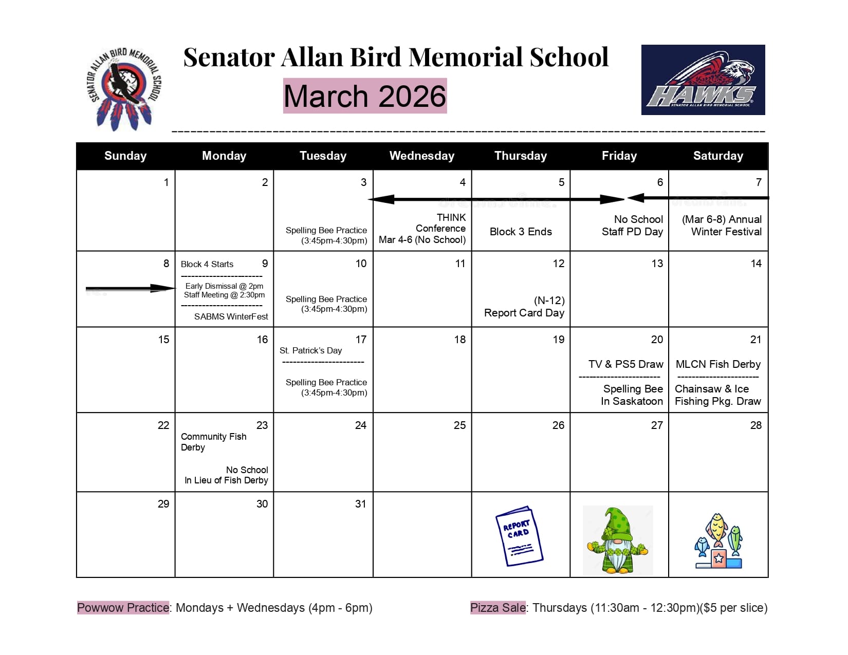 This is the Senator Allan Bird Memorial School calendar for March 2026. It highlights important dates such as the THINK Conference (March 4–6, no school), Block 3 ending, Staff PD Day, and the Annual Winter Festival. Other key events include Block 4 starting, Early Dismissal and Staff Meeting, Report Card Day, St. Patrick’s Day, the TV & PS5 Draw, Spelling Bee in Saskatoon, MLCN Fish Derby, and the Community Fish Derby (with no school in lieu). Ongoing activities like Powwow Practice and Thursday Pizza Sales are also included. You can download this calendar by clicking on the button below.