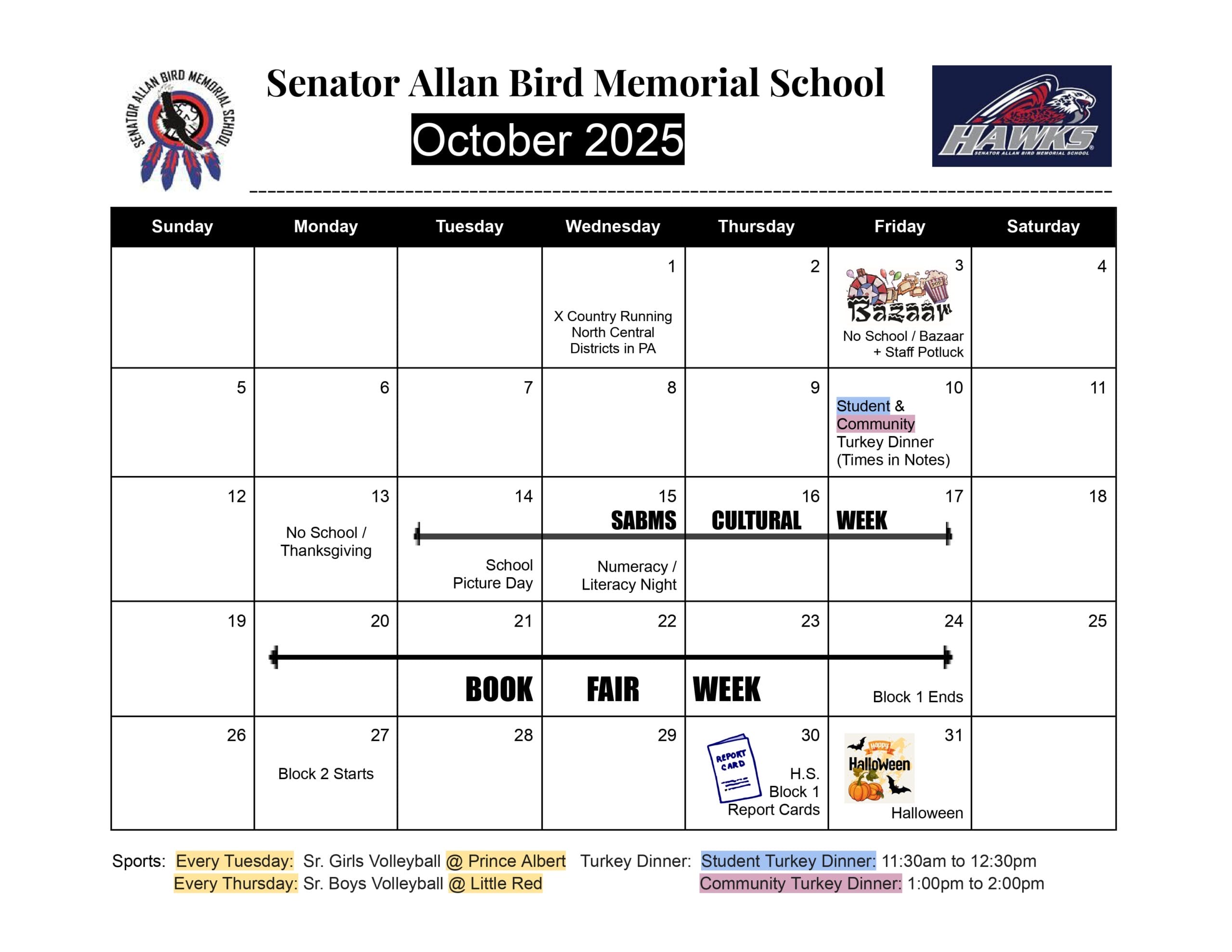 This is the Senator Allan Bird Memorial School calendar for October 2025. It highlights important dates such as Thanksgiving, Picture Day, Cultural Week, Book Fair Week, and special events like the Student & Community Turkey Dinner. You can download this calendar by clicking on the button below.