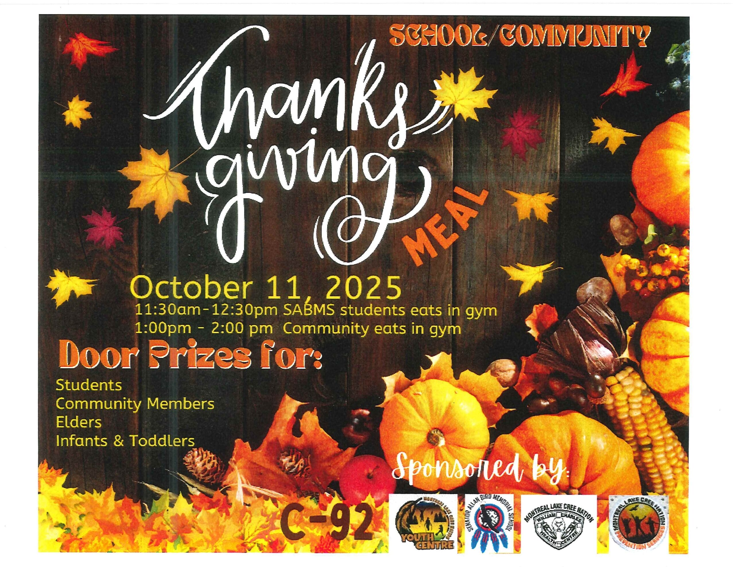 Join us for the School/Community Thanksgiving Meal on October 11, 2025. SABMS students will eat in the gym from 11:30am–12:30pm, and the community meal will take place from 1:00pm–2:00pm. Door prizes will be available for students, community members, elders, and infants & toddlers.