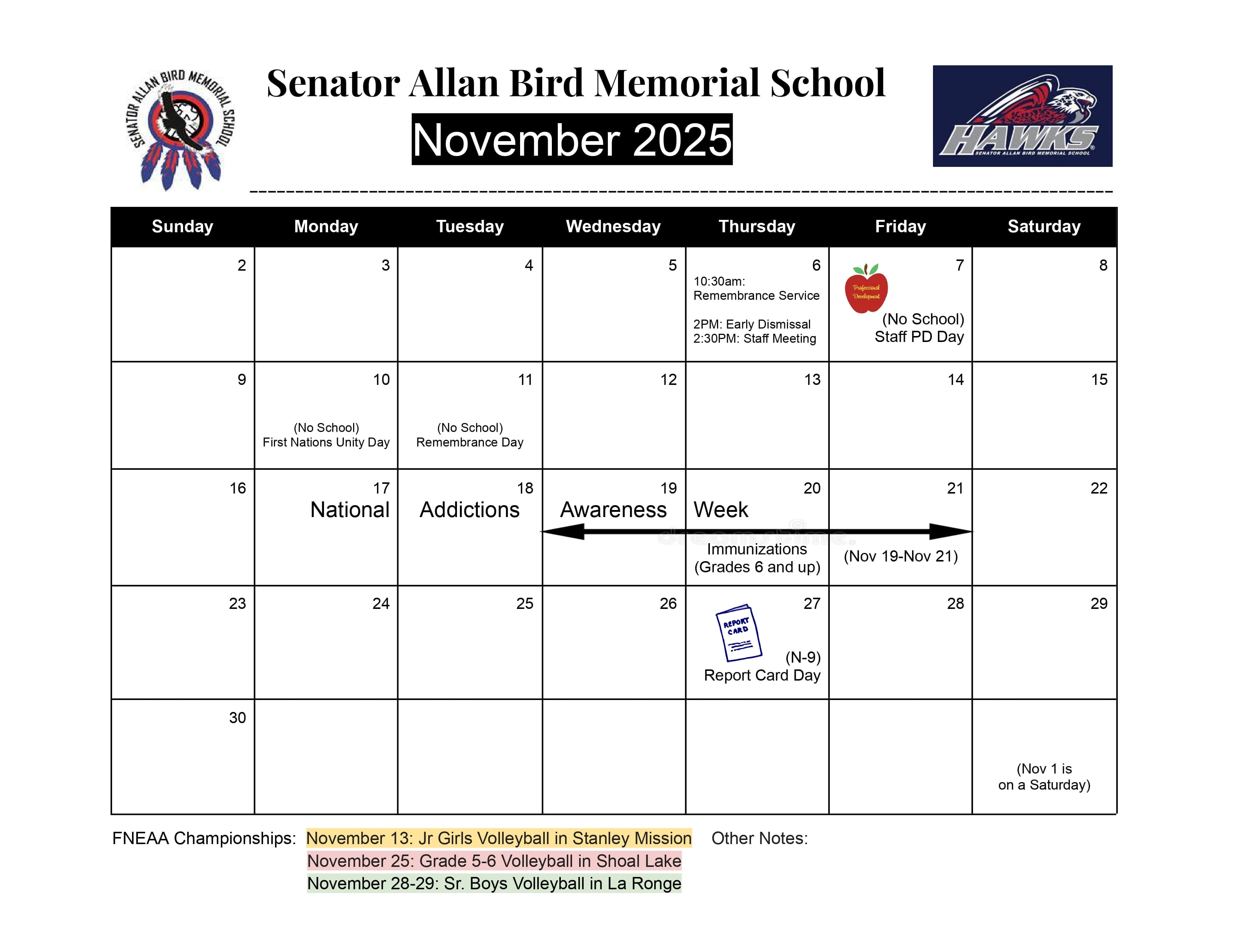 This is the Senator Allan Bird Memorial School calendar for November 2025. It includes important dates such as First Nations Unity Day, Remembrance Day, National Addictions Awareness Week, and Report Card Day. The month also features immunizations for Grades 6 and up, early dismissal, and several volleyball championships. You can download this calendar by clicking on the button below.