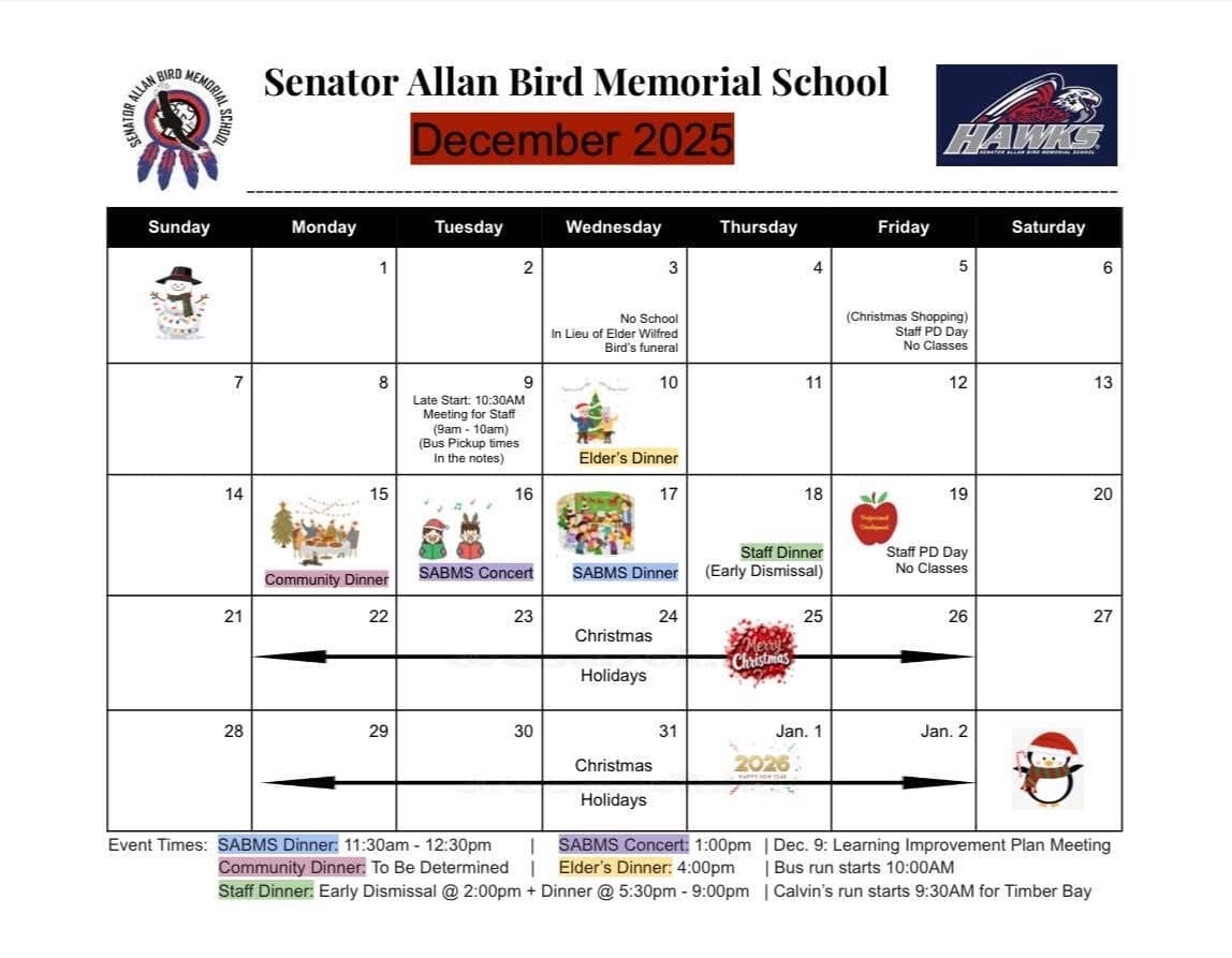 This is the Senator Allan Bird Memorial School calendar for December 2025. It highlights important dates such as the Elder’s Dinner, Community Dinner, SABMS Concert, Staff Dinner with early dismissal, and Staff PD Day. The calendar also includes Christmas holidays and special schedule adjustments like late start and bus time changes. You can download this calendar by clicking on the button below.