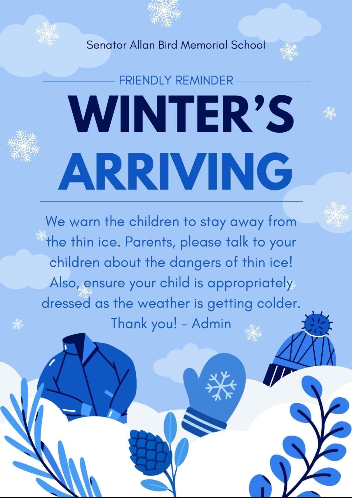 Senator Allan Bird Memorial School is sharing a friendly reminder that winter is arriving. Students are being warned to stay away from thin ice, and parents are encouraged to talk with their children about the dangers it poses. Families are also asked to ensure children are appropriately dressed for the colder weather. Thank you for helping keep our students safe.