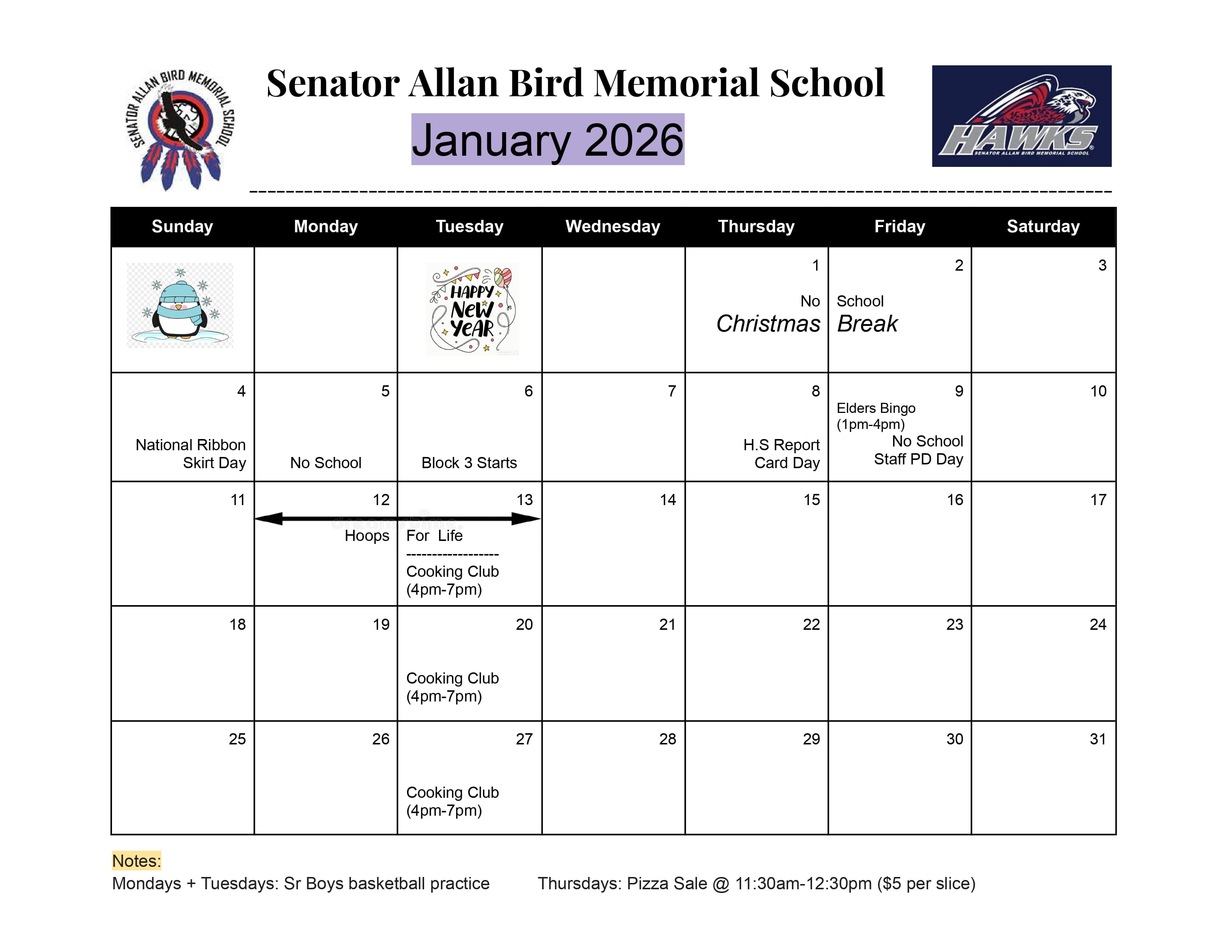 This is the Senator Allan Bird Memorial School calendar for January 2026. It highlights important dates such as New Year’s Day, the continuation of Christmas Break, National Ribbon Skirt Day, High School Report Card Day, Elders Bingo, and the start of Block 3. The calendar also includes ongoing activities like Hoops for Life, Cooking Club sessions, senior boys basketball practices, and weekly pizza sales. You can download this calendar by clicking on the button below.