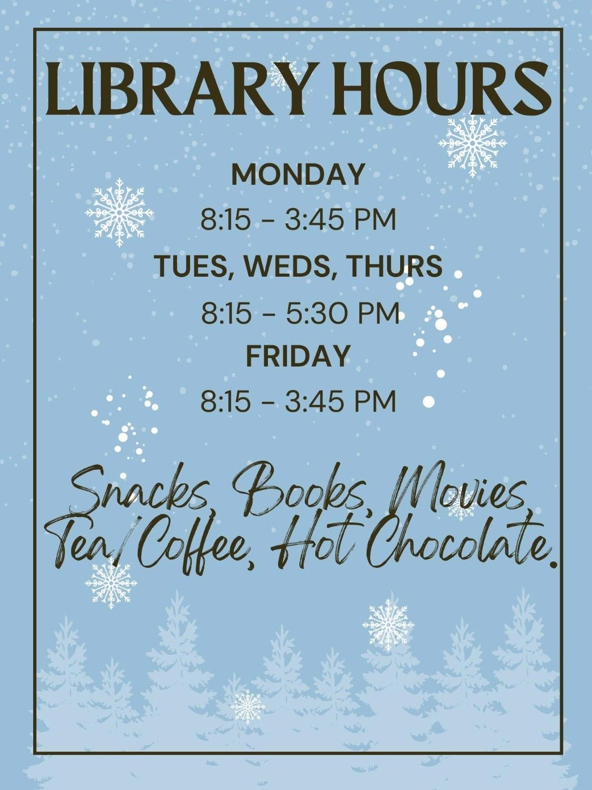 This is the Senator Allan Bird Memorial School Library Hours information. It outlines the weekly hours of operation: Monday from 8:15 AM to 3:45 PM, Tuesday, Wednesday, and Thursday from 8:15 AM to 5:30 PM, and Friday from 8:15 AM to 3:45 PM. The library offers a welcoming space with snacks, books, movies, and warm beverages such as tea, coffee, and hot chocolate.