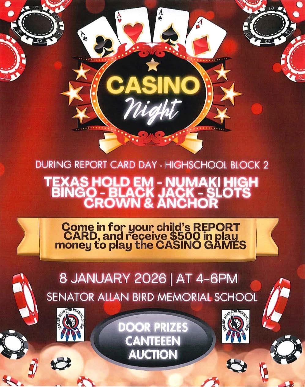 This is the Senator Allan Bird Memorial School Casino Night event, held during Report Card Day for High School Block 2. Families are invited to come in for their child’s report card and enjoy an evening of casino-style games, including Texas Hold ’Em, Numaki High Bingo, Black Jack, Slots, and Crown & Anchor. Attendees will receive $500 in play money to participate in the games. The event takes place on January 8, 2026, from 4:00 PM to 6:00 PM at Senator Allan Bird Memorial School. Door prizes, a canteen, and an auction will also be available.
